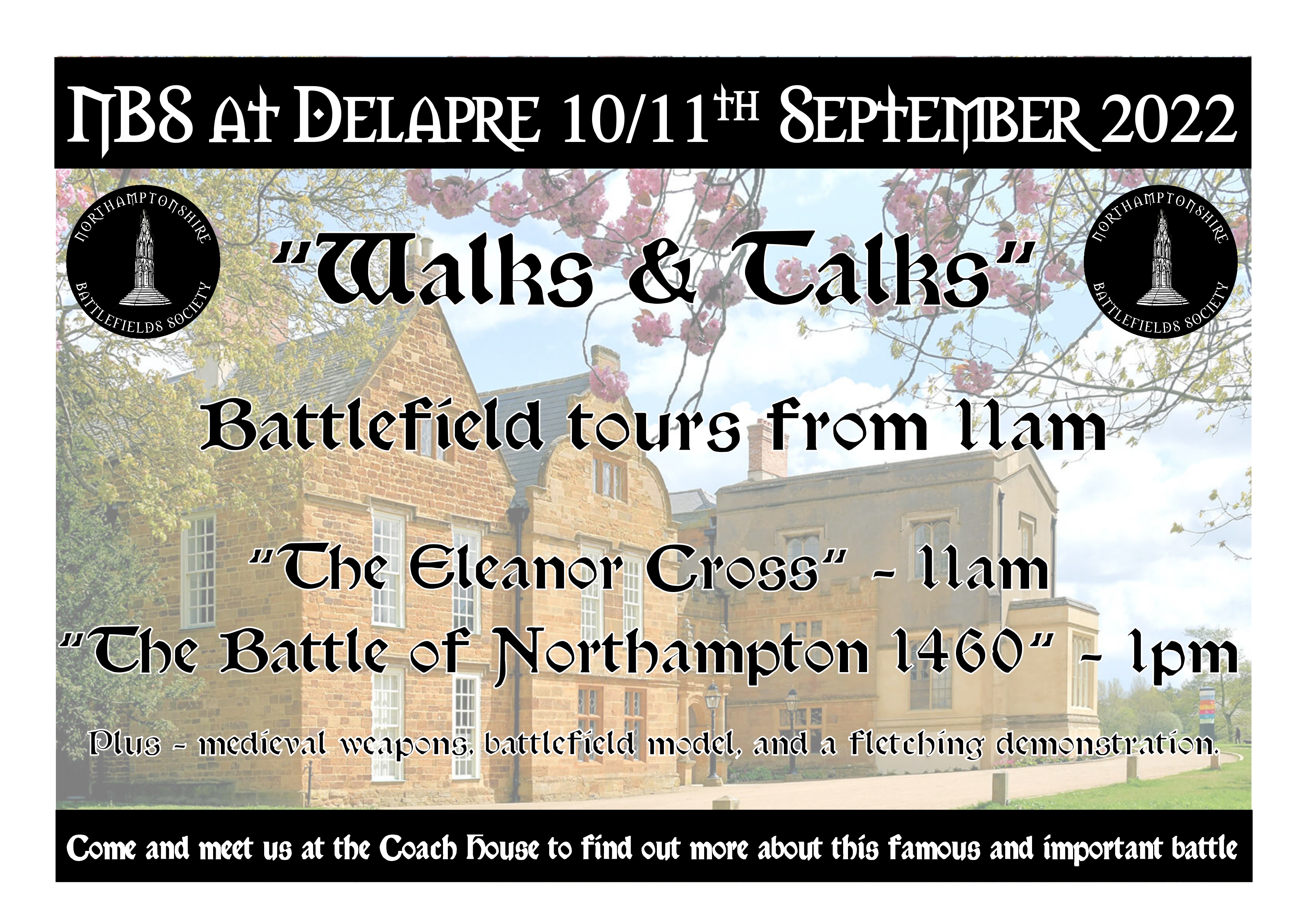 We will be back at the Coach House this year, offering short walks of the parkland end of the battlefield, and talks about both the Eleanor Cross by Jenny Rose, and the 1460 Battle, by Graham Evans. All these are free, although donations are always welcome.