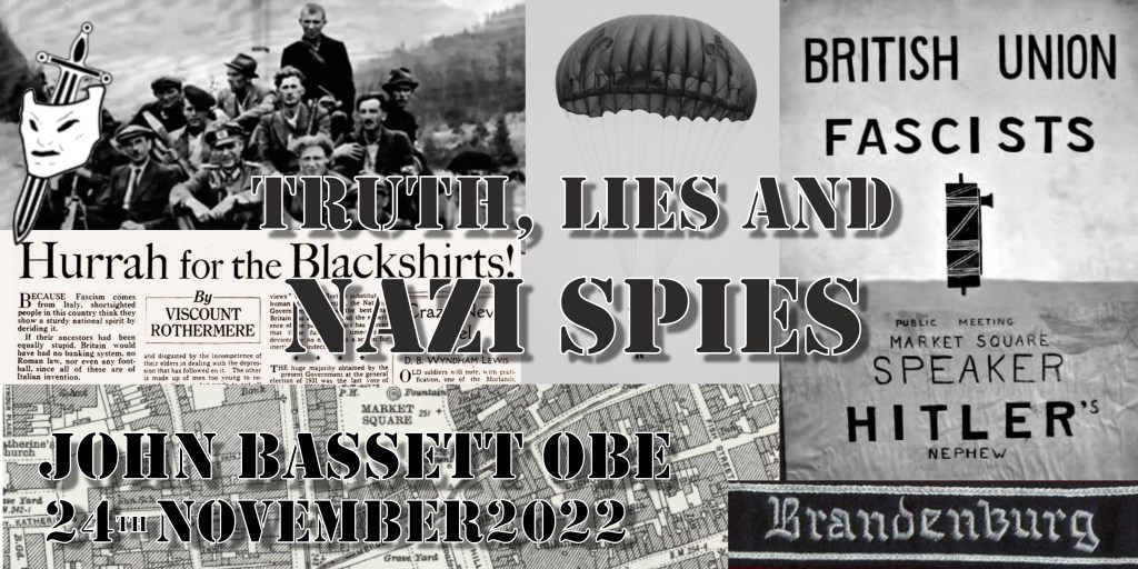 John Bassett OBE returns to give us another more modern talk. His previous forays into Allied WW2 covert operations and the Cuban missile crisis have passed into Society legend as not to be missed events. This talk will look at the county’s links to the British union of Fascists in the inter war years, and also the English speaking elements of the Brandenburger group, operated by German intelligence during WW2, and looks to be equally enthralling.