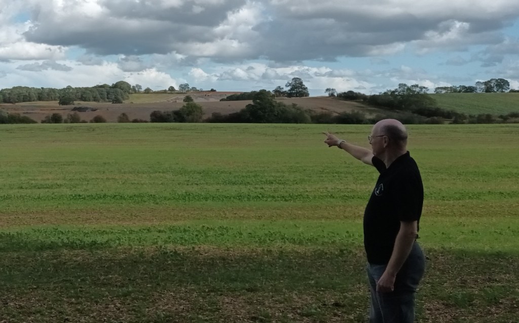 NBS Chair, Graham Evans, points at the large mound of earth on the Culworth side of the battlefield during the recent walk.