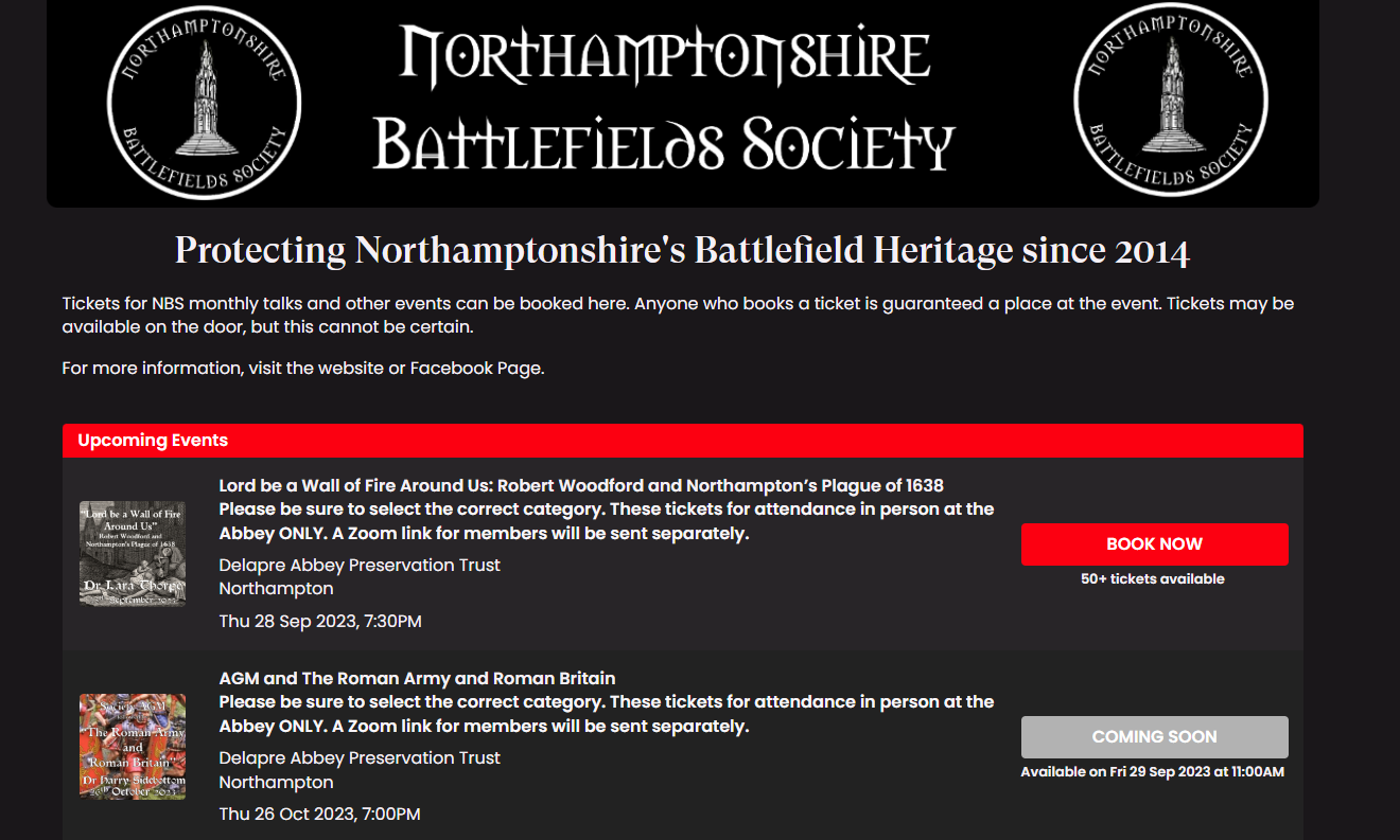 The Society holds its monthly meetings on the last Thursday of every month except for August and December. Meetings are held at Delapre Abbey. They start at 7:30pm and are open to members of the public as well as Society Members. Meetings are conducted on a hybrid basis, with a Zoom link provided to fully paid up members. Attendance in person is via ticket from the Ticketmaster website.