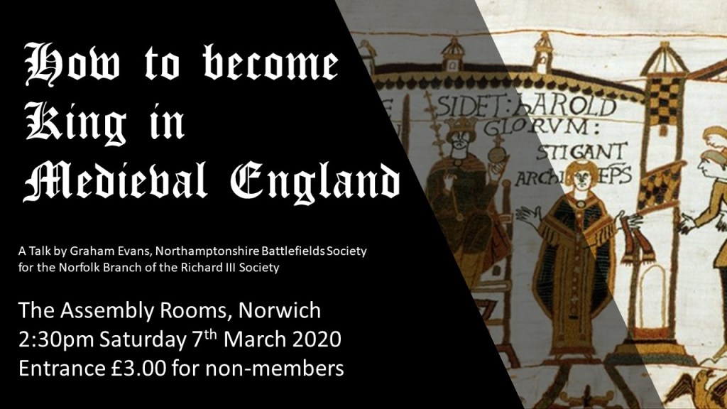 Graham will be giving his “How to Become King in Medieval England” talk., which proved quite a hit when given to the Society in November 2019. Open to non-members.